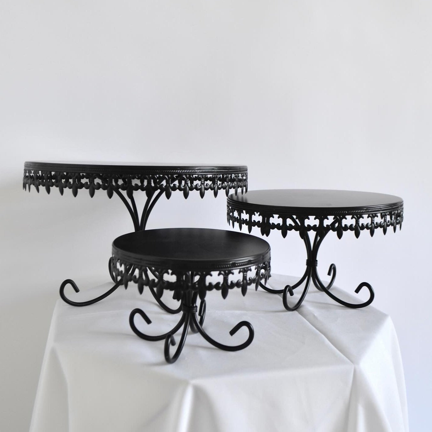 Add some sophistication and flair to your cakes with our fun and elegant black metal cake stand featuring fleur de Lis detailing. Ideal for any event, it will elevate your décor and bring a touch of joy to any occasion! Rented as a set of 3.