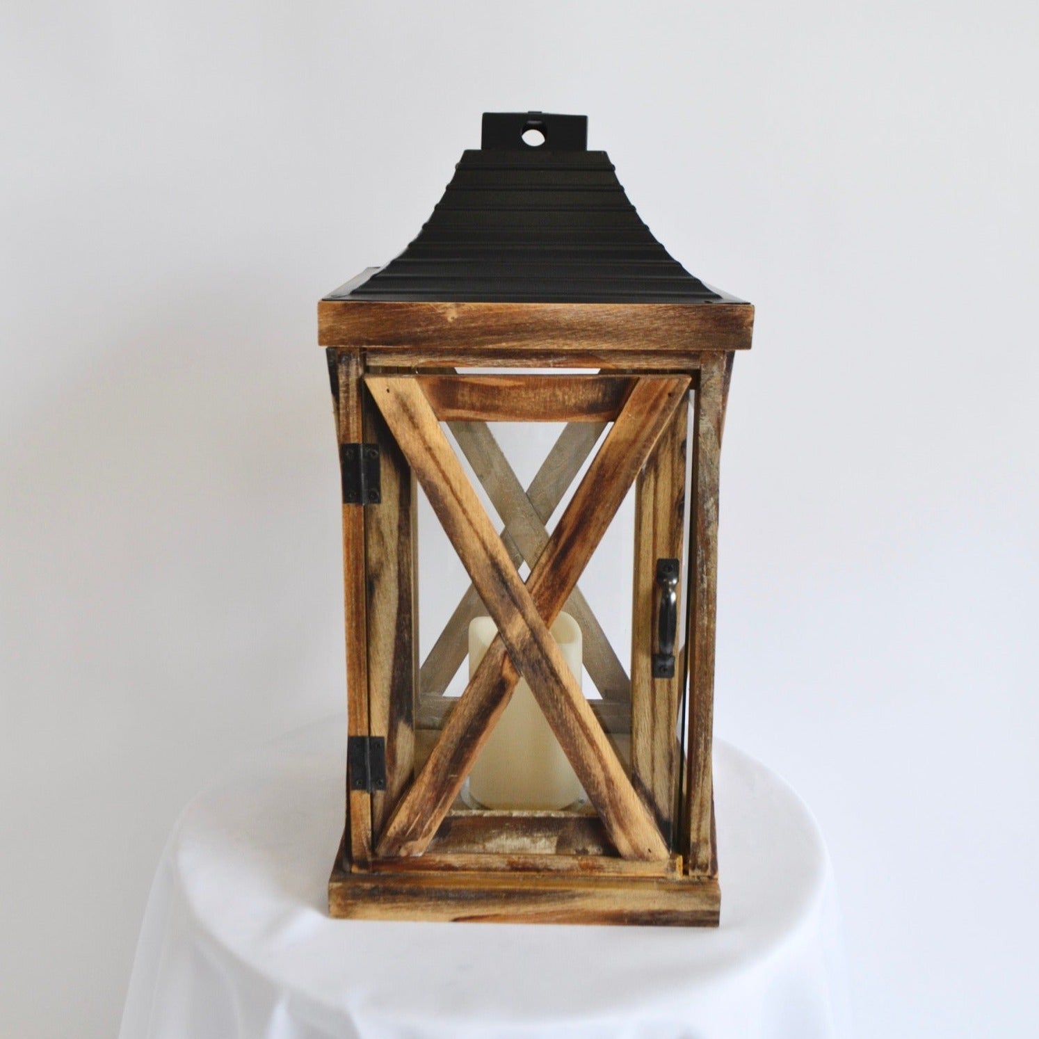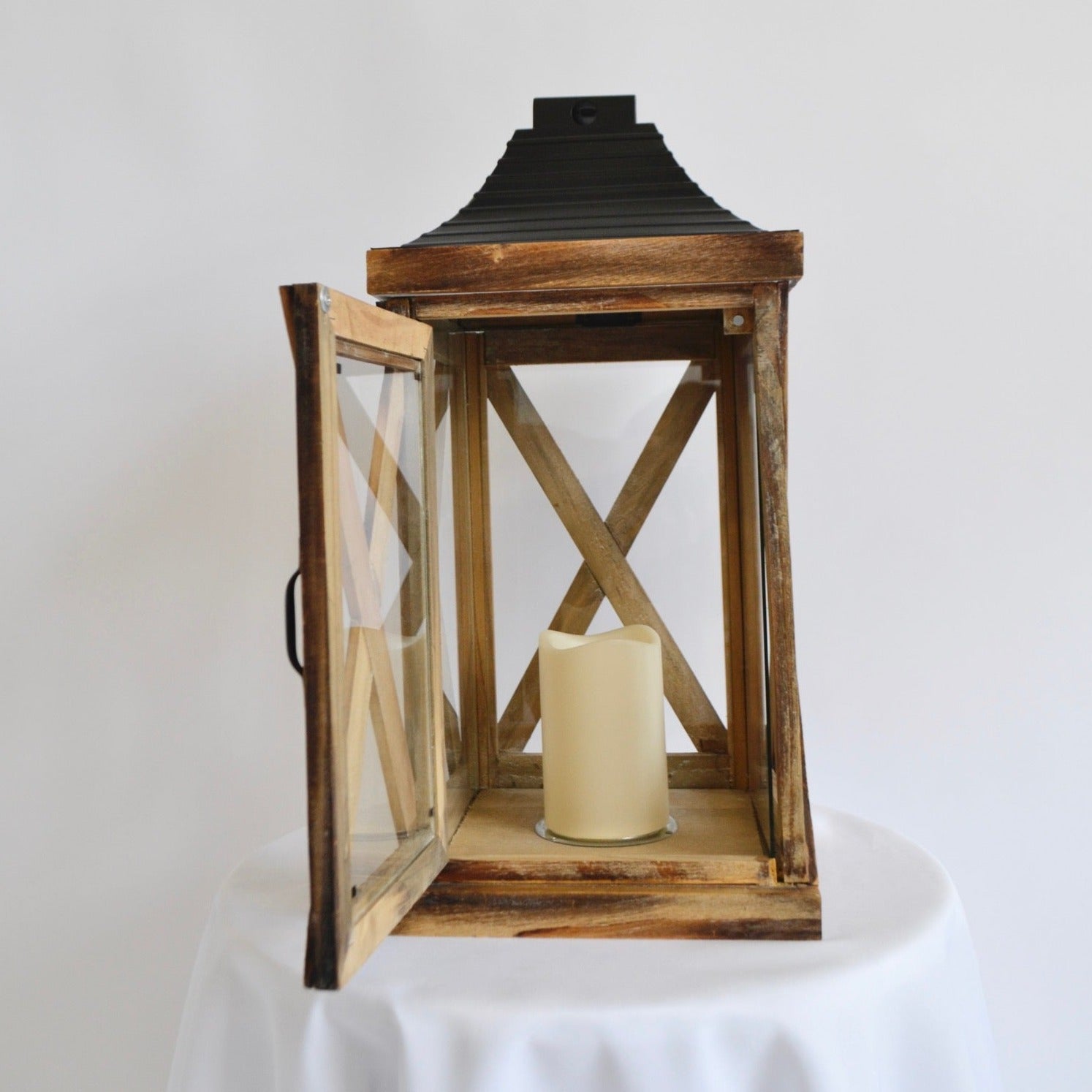 Add a rustic and elegant touch to any event with our large ceremony lantern. The fine natural finish and wood cross design make for a beautiful ambiance. Perfect for weddings, parties, or any special occasion. These lanterns are perfect for both indoor or outdoor use. LED candle included. 2 available