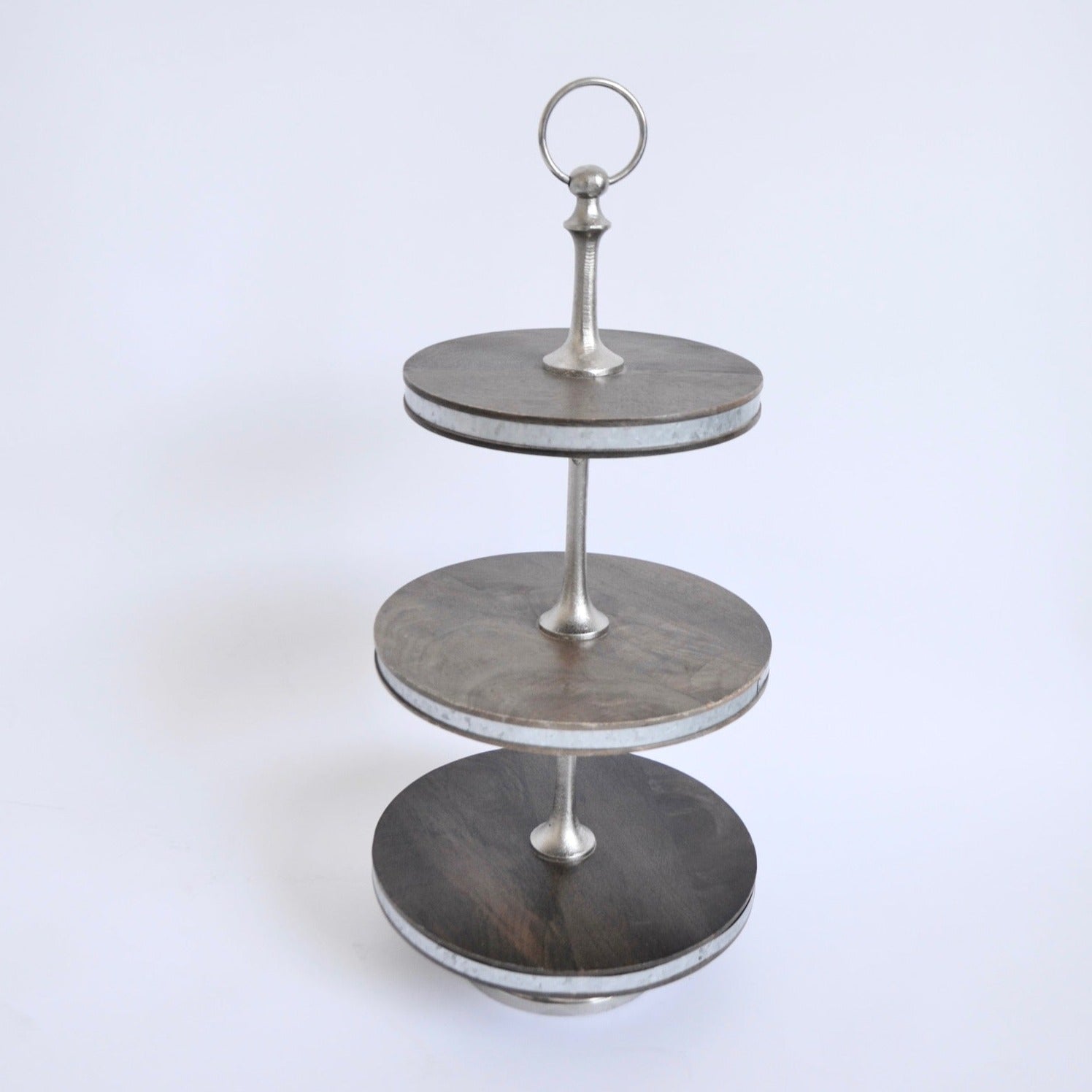 Elevate your hosting game with our silver metal and wood 3 tier serving stand. Perfect for displaying appetizers, desserts, or anything else your heart desires. Upgrade your hosting experience and impress your guests with this stylish and functional serving tray.