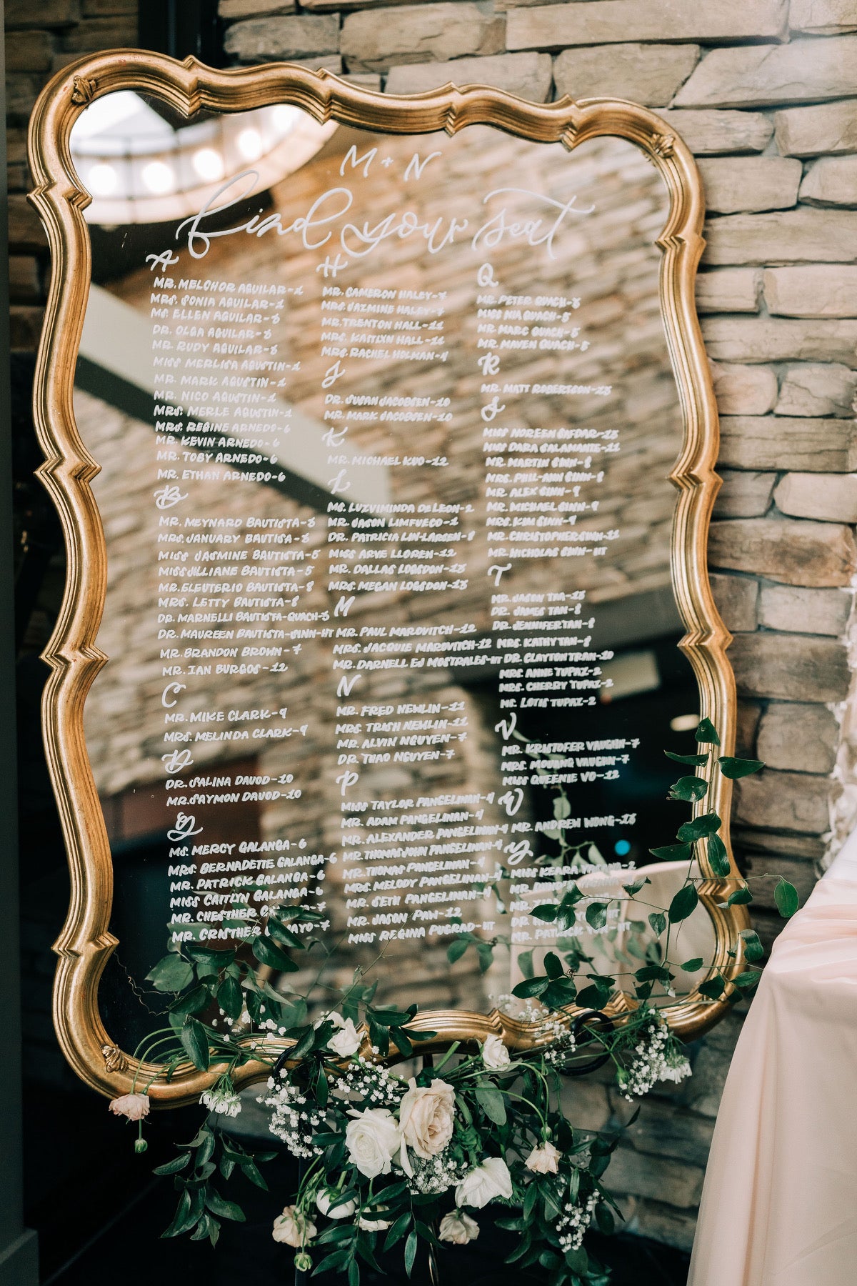 Transform your event into a luxurious affair with our Gold Ripple Rectangle Mirror. Its intricate scalloped design adds a touch of elegance to any occasion, making it the perfect backdrop for a stunning wedding seating chart. Elevate your event with this premium addition.