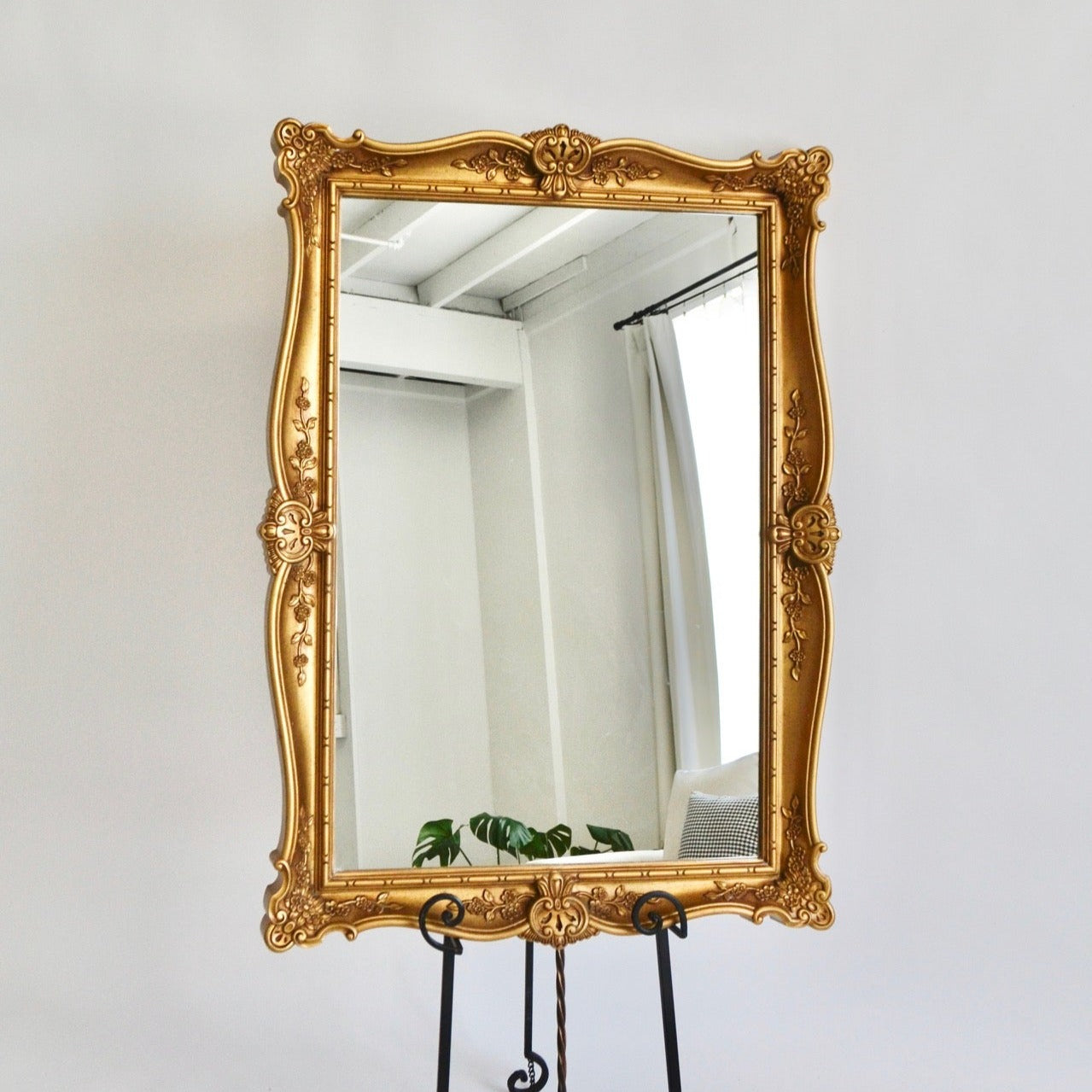 Elevate your event with our ornate gold rectangular mirror. The perfect addition for a stunning intimate wedding escort board or welcome sign. Create an inviting atmosphere with a touch of luxury and sophistication.